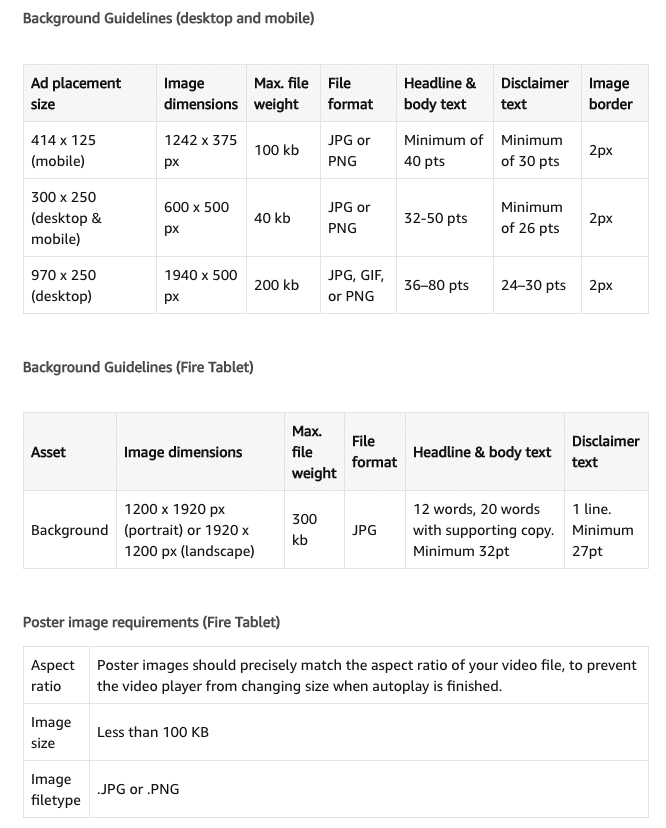 Amazon video ads do require the video itself as well as a background image for the placement. There are different background image requirements for different devices which can be seen below: