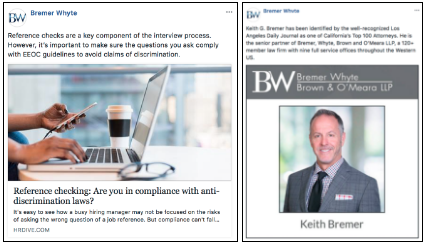 Posts on a Facebook Page will vary based on what industry you are in. If your company is B2B, your content may include company information, industry trends and updates, recruiting posts, testimonial posts from past clients, credible quote posts, employee spotlights, and so much more. Below are a couple examples from Bremer Whtye’s page, a Law Firm, including an article on industry tips and an employee highlight.