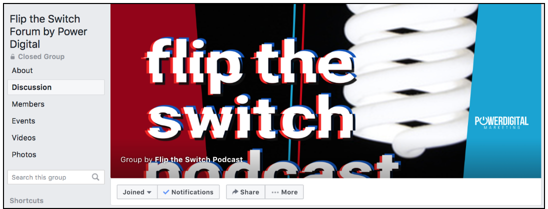 If revenue is not the main goal of creating a Facebook Group, perhaps it is brand credibility. For instance, here at Power Digital, we have an awesome podcast, Flip The Switch (shameless plug-in). This podcast shares current industry information regarding marketing, cryptocurrency, and other trending business savvy information. To further boost their credibility, their Facebook Page also has a private Facebook Group in which the cast and the group’s members can engage in discussion.