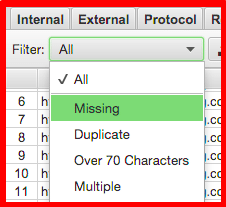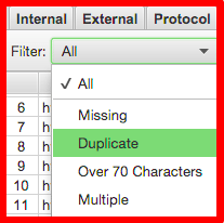 This is where you will see the full list of H1s on your website. Download the complete list of H1s by selecting “all” and export the list. If you notice that you are missing H1 tags for a page or you have duplicate H1s, you need to fix these.