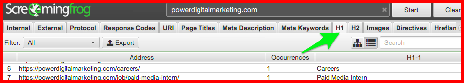 Follow the following process using Screaming Frog for a complete H1 audit.
