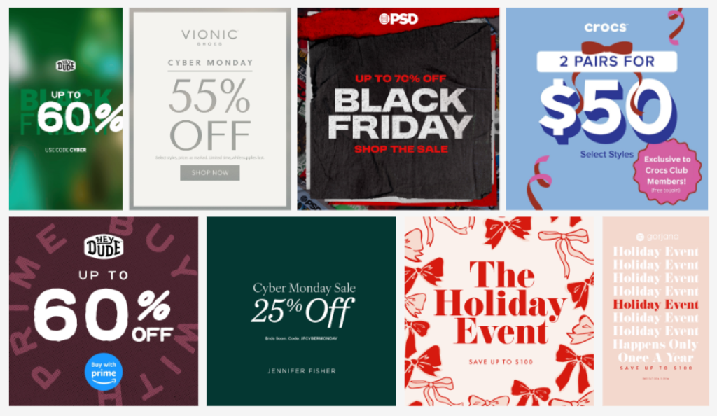 E-commerce ads that featured bold, large text, and clear calls to action were highly effective. Simple backgrounds and easy-to-read fonts were crucial in making the promotion clear, with messaging like “Cyber Monday” or “50% Off” resonating strongly. Ads that conveyed a sense of urgency, like “Last Chance” or “Ends Today,” performed better in grabbing attention.