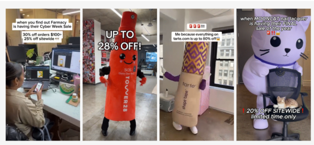 Short-form comedy skits took off during BFCM, with beauty brands using unpolished, chaotic videos that mimicked TikTok trends. Mascots or employees played leading roles in these skits, adding a layer of authenticity and relatability to the content. These unfiltered, lighthearted approaches helped beauty brands break through the noise and connect with audiences in a fun, engaging way.