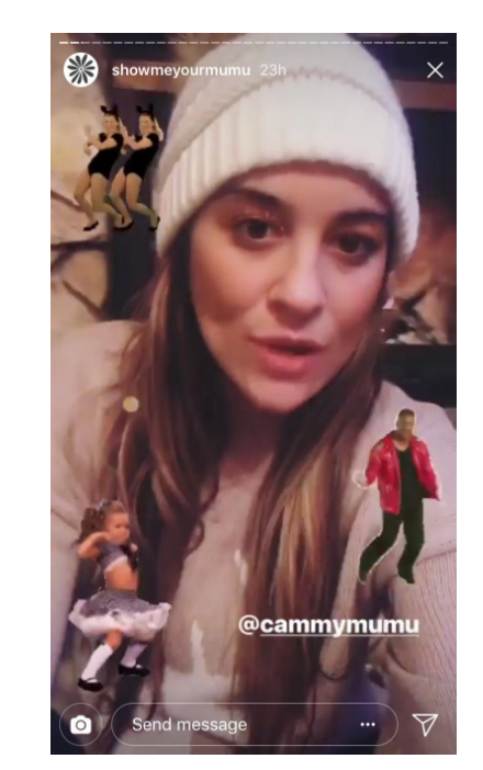 Show Me Your Mumu, a women’s clothing brand, is also incorporating GIF stickers into their content. As you can see from the screenshot below, they are using multiple to really grab your attention. In this particular case, the founder is telling a story, which is also an extremely personal and effective way for the brand to connect with its audience.