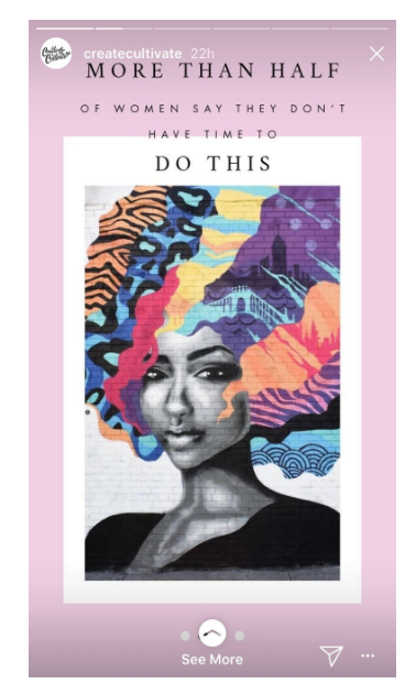 Put the extra effort into your Instagram Story by trying a new format. Similar to the content below by Create & Cultivate, your brand can create a new Instagram Story template in order to stop the thumb scrolling and direct users to view and read your Story.