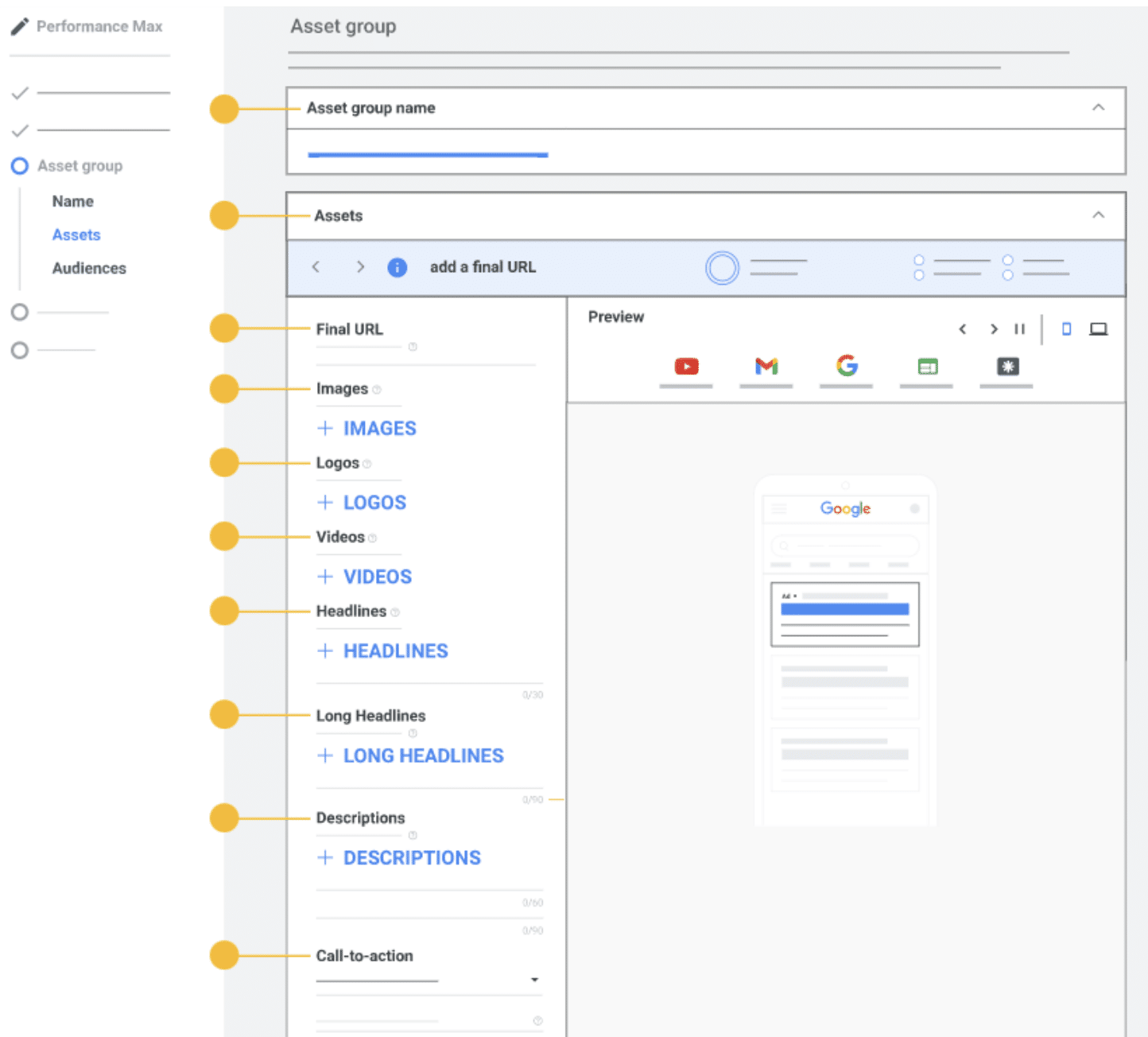 Now that your initial settings are ready, you’ll build what’s called an “asset group.” Similar to a Search campaign’s ad group level but made up of also of the components traditionally at the ad level, an asset group is where the images, logos, headlines, descriptions, videos, and audience signals live