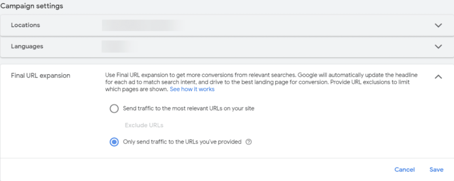 We recommend launching a PMax campaign with the URL Expansion setting disabled, or at the very least excluding irrelevant pages, like the Blog and FAQs. This will ensure you’re not wasting spending on pages that don’t necessarily move the needle and get you closer to the end goal. If this is enabled, Google will replace your specified URL with one it deems more relevant. This could be helpful but does open the door for potentially inefficient spending.