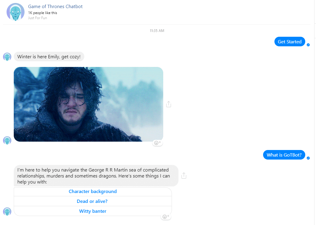 Game of Throne has a real cool bot! This is a great way to get users to rave about a show and get watch ratings up.