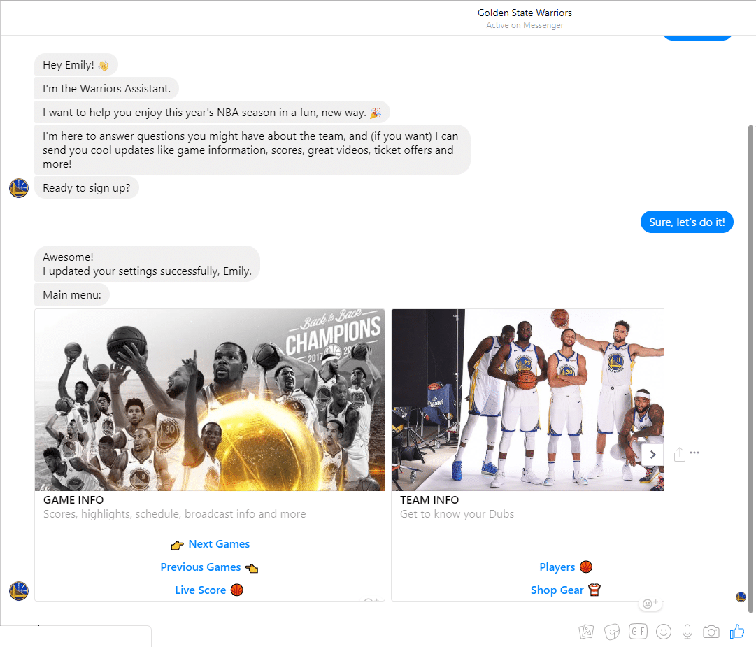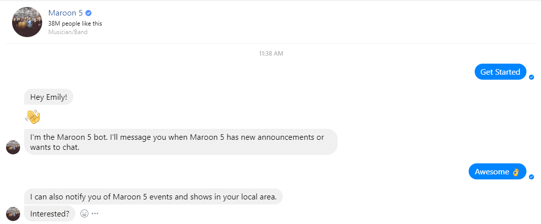 Check out these bots that generate ticket sales. Both the Golden State Warriors and Maroon 5 play to the ego of their fans and additionally let them know when they’ll be in that respective fans city.