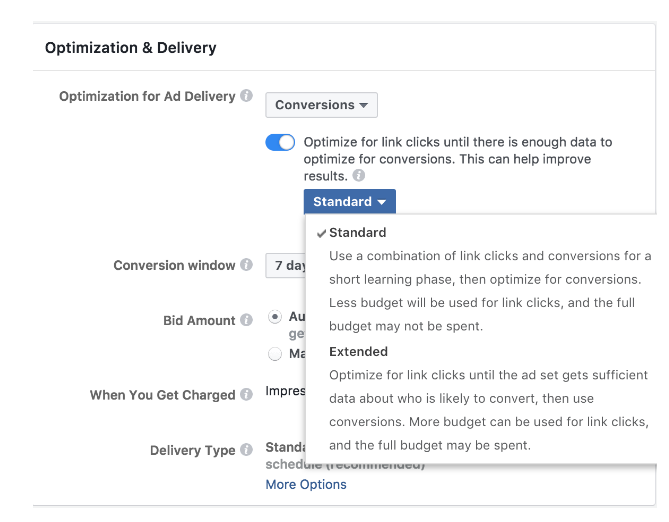 “If you only care about conversions and just want to give your ad set a better chance at getting them when it starts running, we recommend Standard optimization. If you’re more concerned with spending your full budget or getting enough delivery to, say, test your ad creative, we recommend Extended optimization. If you’re unsure which is right for you, start with Standard optimization and switch to Extended if you don’t get enough delivery”.