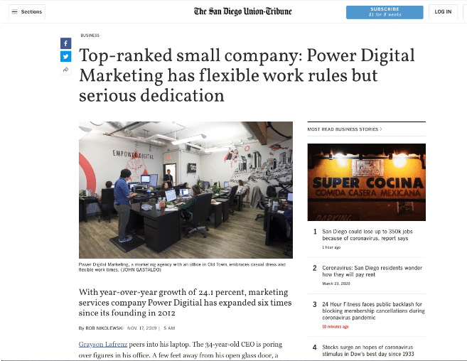 San Diego Union Tribune Selects Power Digital as #1 Best Place to Work