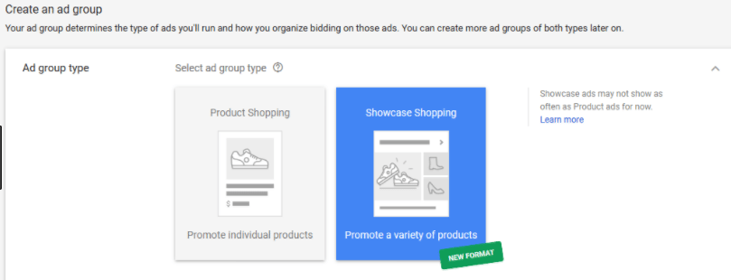 There has also been the inclusion of Show Case shopping ads! This is a new ad type for product listing ads that we’re all pretty excited to start using. When you create a new shopping campaign, you’ll be able to see a new ad group type when going through the setup process in the new UI.